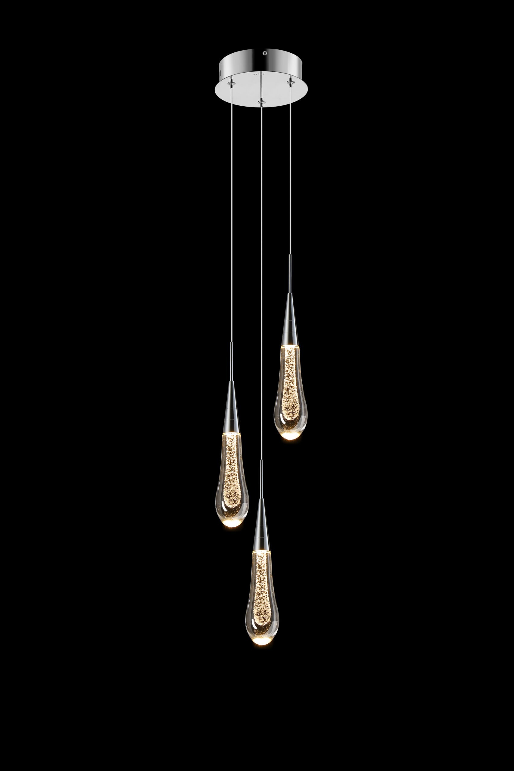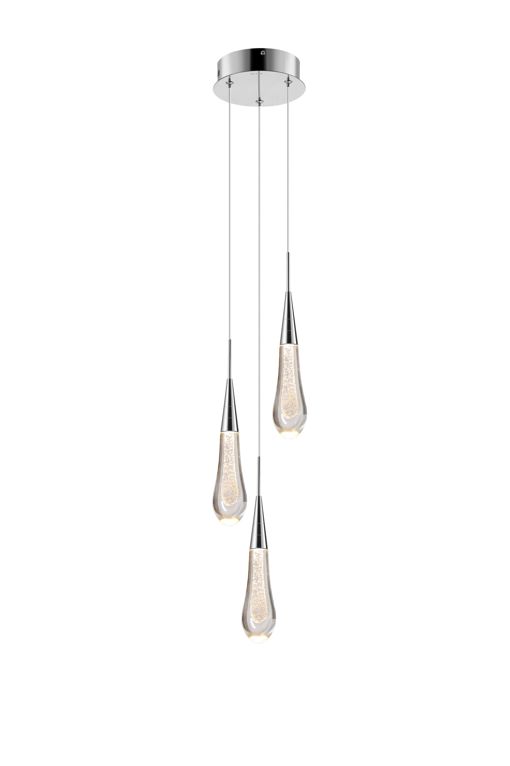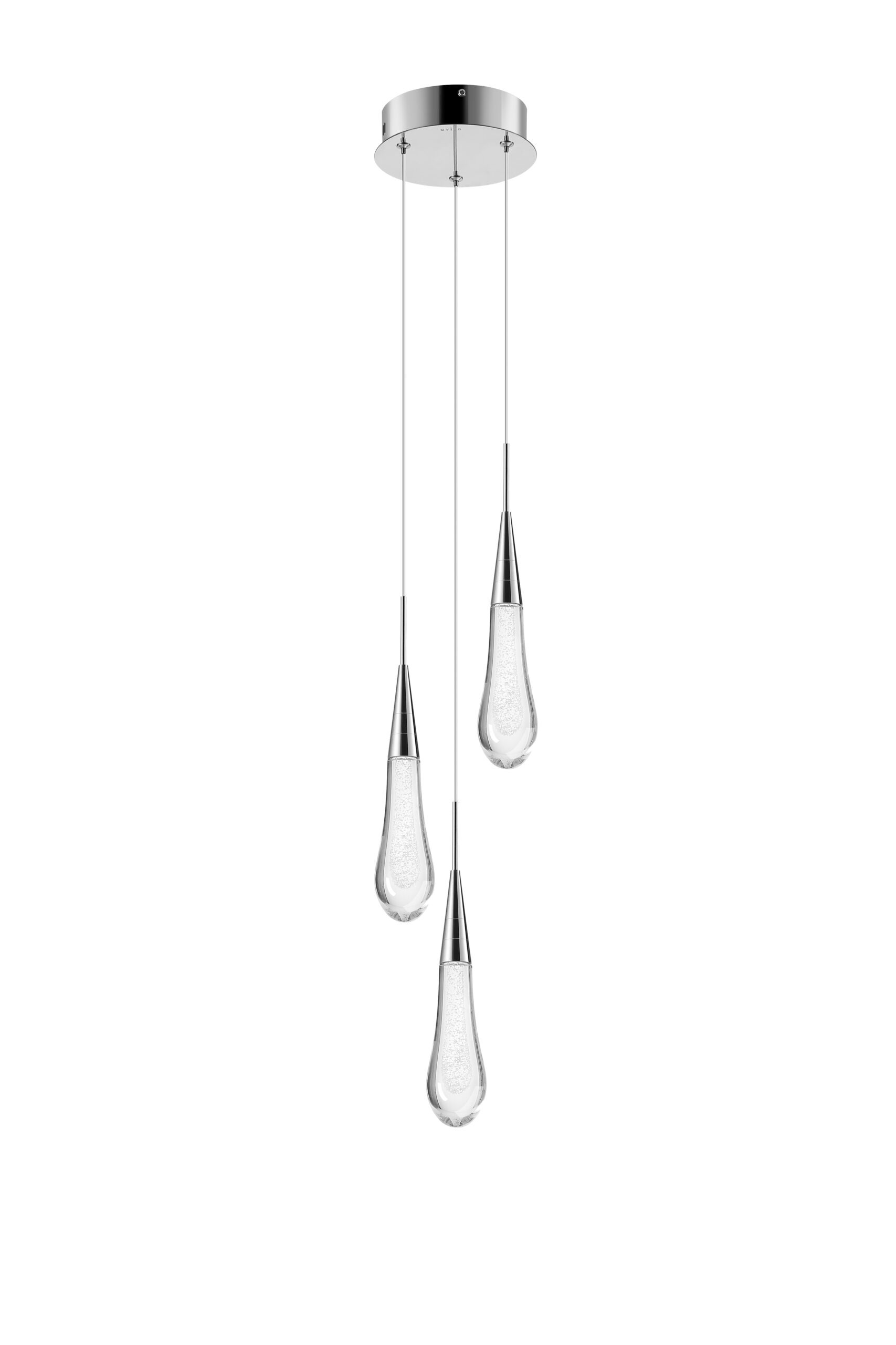 3 LED Pendant in a polished Chrome finish, with a clear teardrop shaped glass infused with a blast of air bubbles.