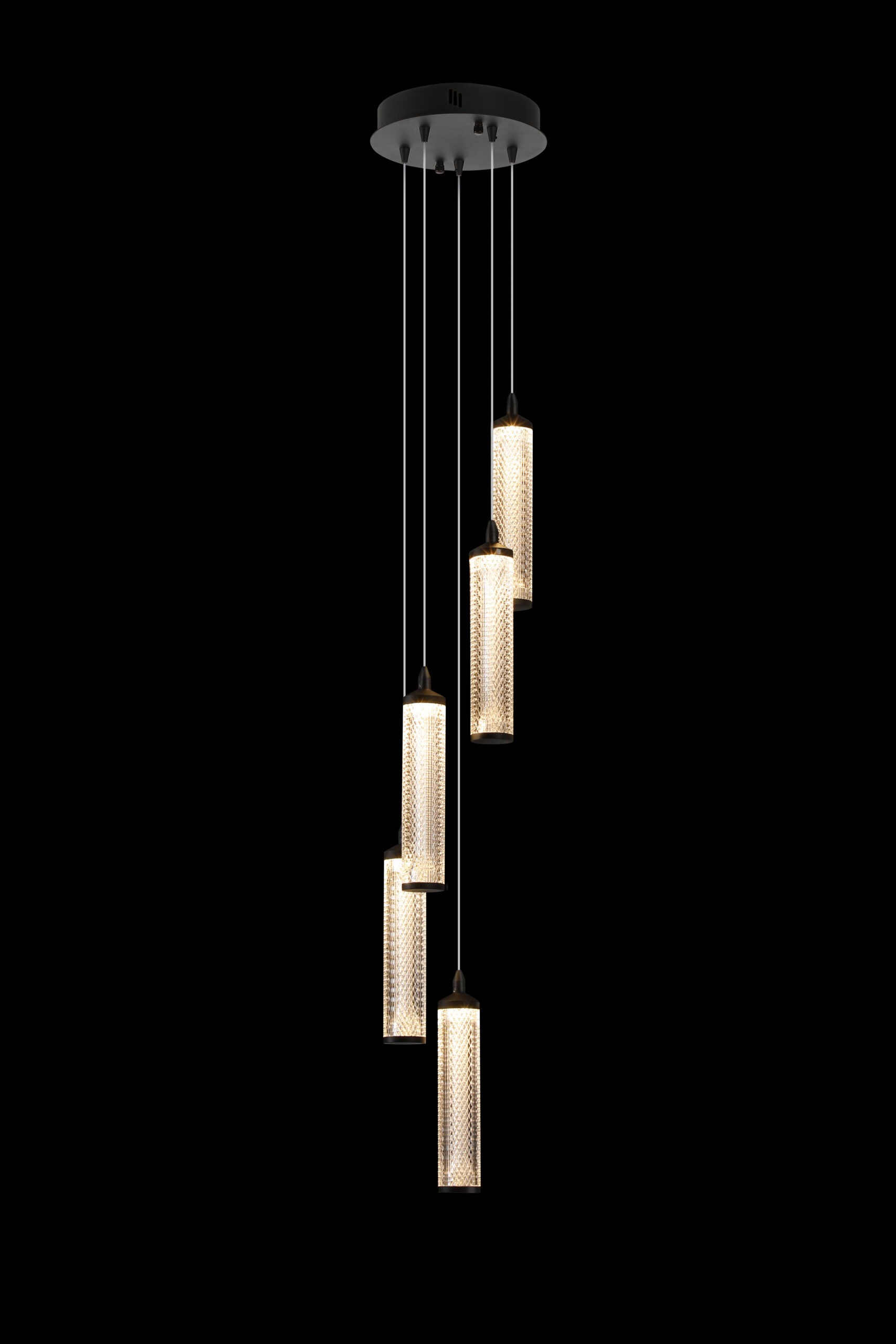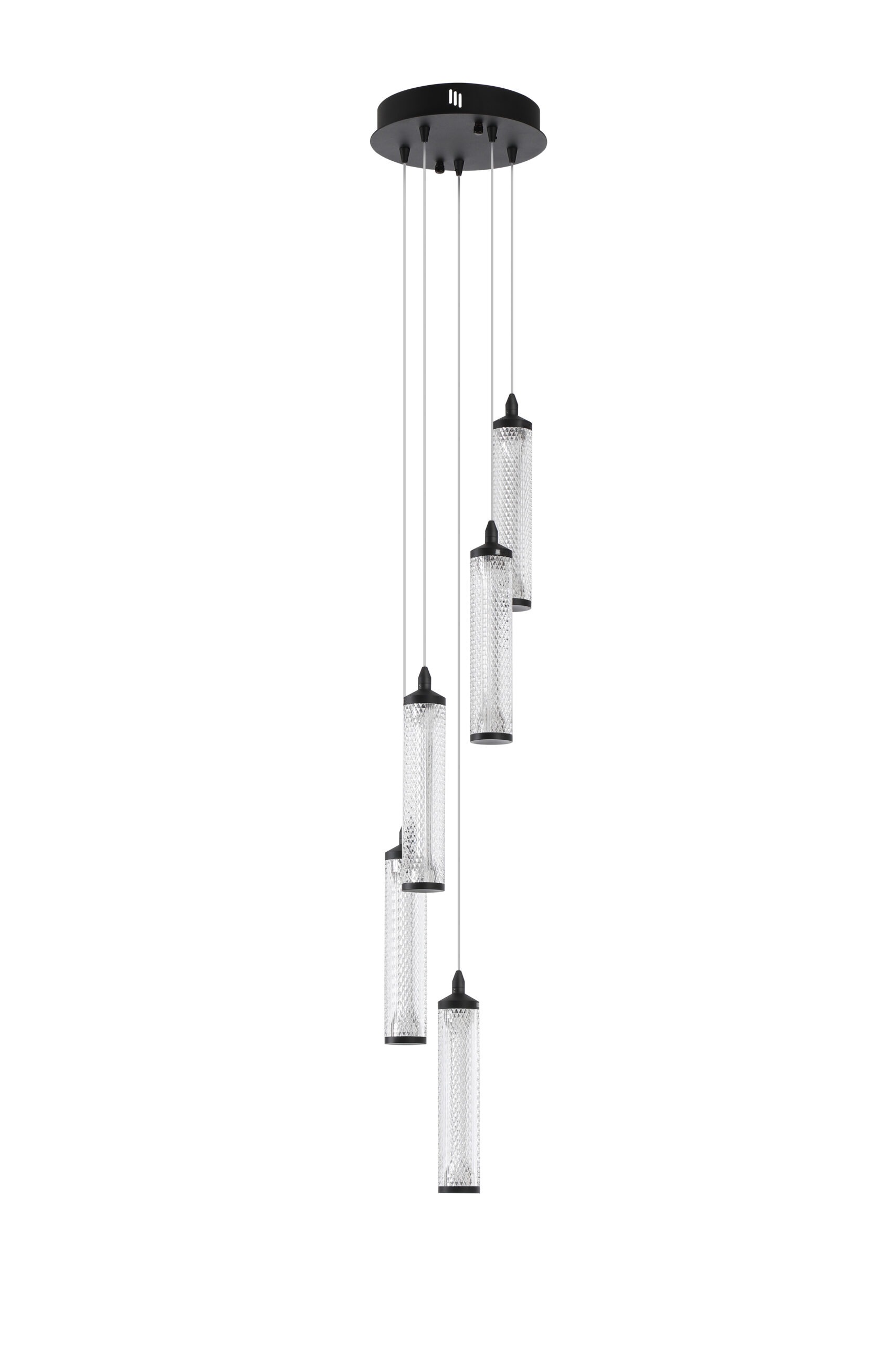 A stylish acrylic 5 LED Pendant, with a hand carved diamond cast shade styled on a Matte Black base with a clear flex. Height adjustable to shorten.